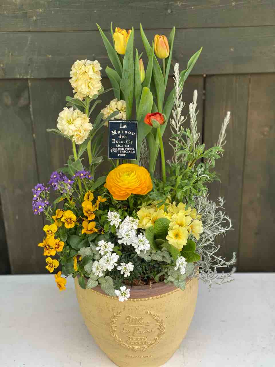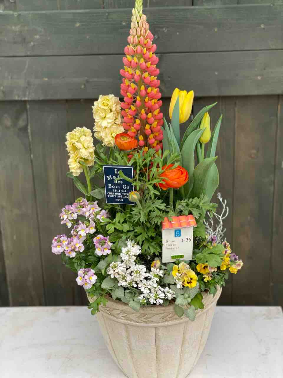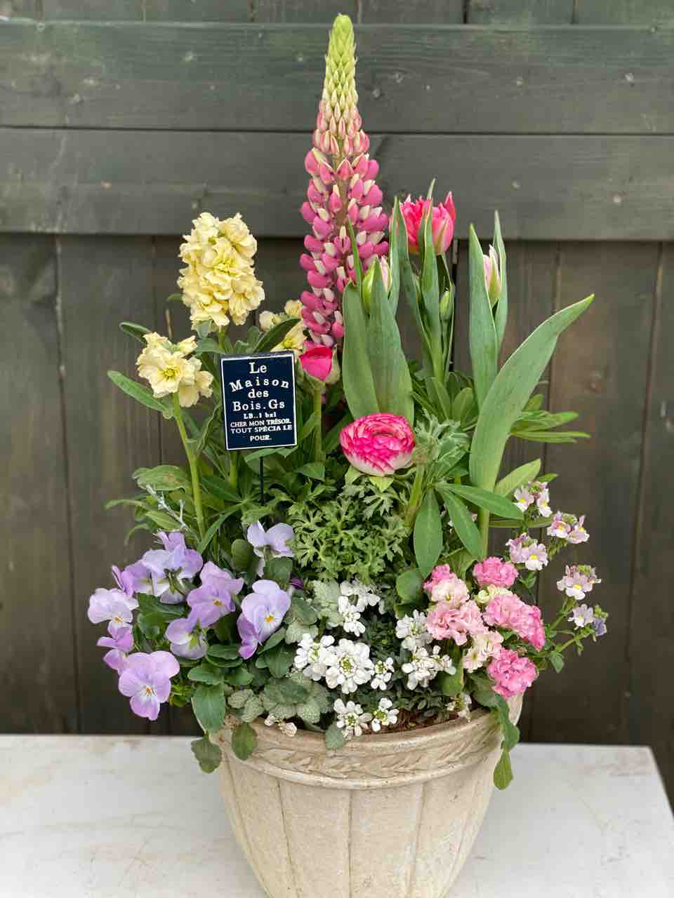 チューリップやルピナス、ストック、ラナンキュラスをメインにビオラ、ジュリアン、アリッサム等を入れて作成しました。
