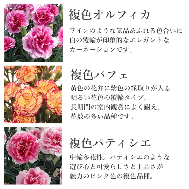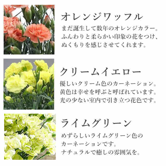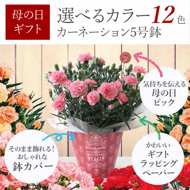 お洒落なカバー入り、ラッピング、母の日ピック、メッセージカード付きで12色から選べます。