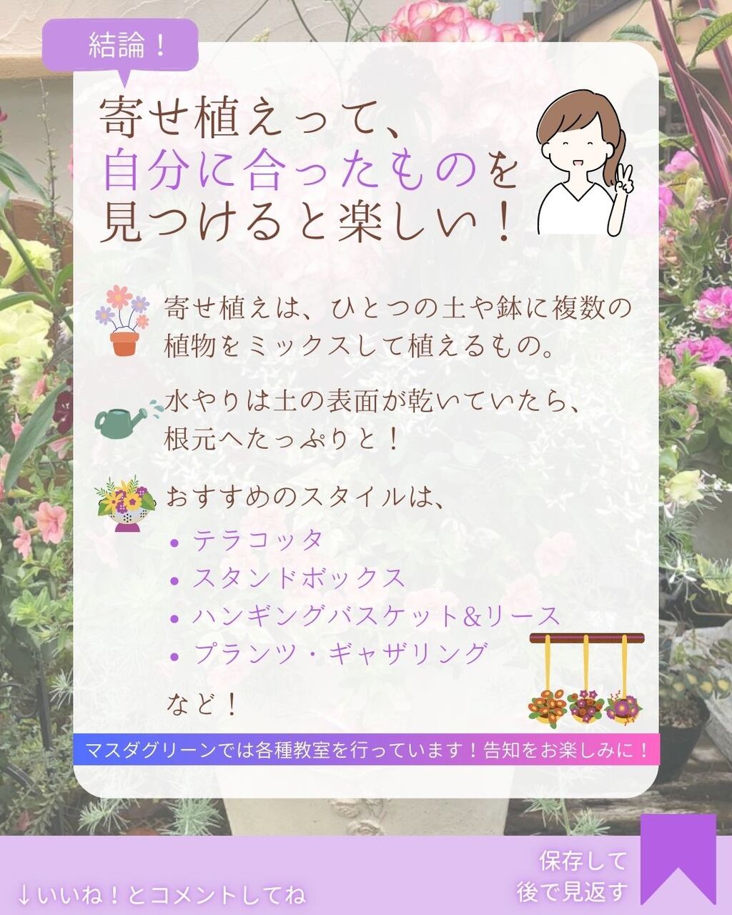 地域の人に愛される地域密着の店つくり、そして花の楽しみ方を提案する寄せ植え教室などのお花の教室も多数開催し、提案型の店を目指しています。